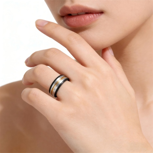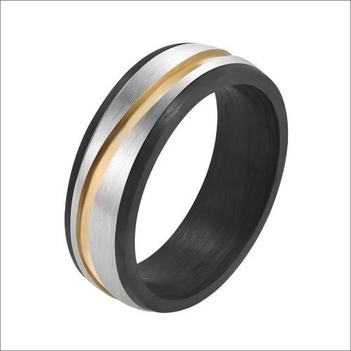 Elevate your jewelry inventory with our best-selling Titanium Ring collection. Crafted from Pure Titanium, this 7mm band features a sophisticated three-tone design: a durable grey titanium base, a striking black Carbon Fiber style inlay, and a luxurious 18k Gold Plated center strip accented with a sparkling Cubic Zirconia (CZ) stone.