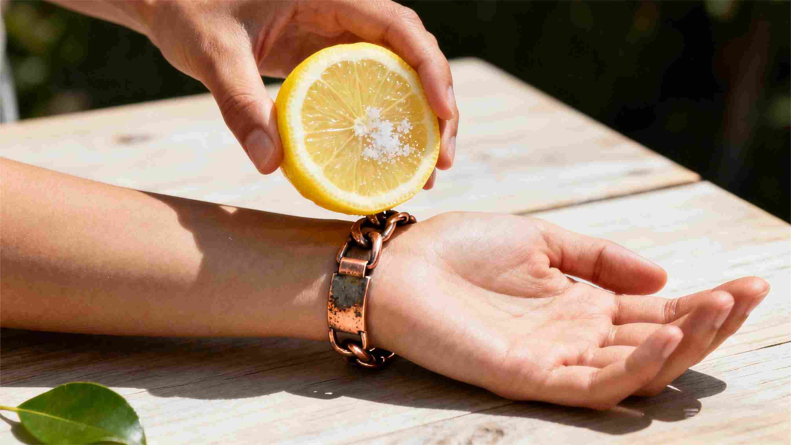Cut the lemon in half (as shown in Picture: A hand holds half a lemon, ready to wipe a copper bracelet).